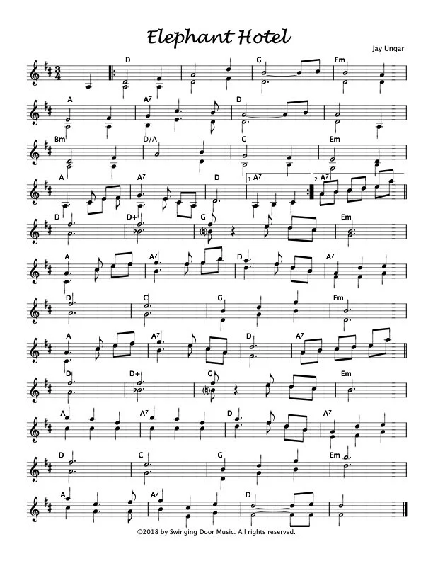 The waltz, “Elephant Hotel,” was my attempt to emulate “ Westphalia Waltz,” which has always been one of my favorites to play for dancers. The inherent rhythm of the melody is so “danceable.” When playing “Elephant Hotel,” think about providing lift when you play the pickups leading into the first three bars in the first three lines of the A-part.